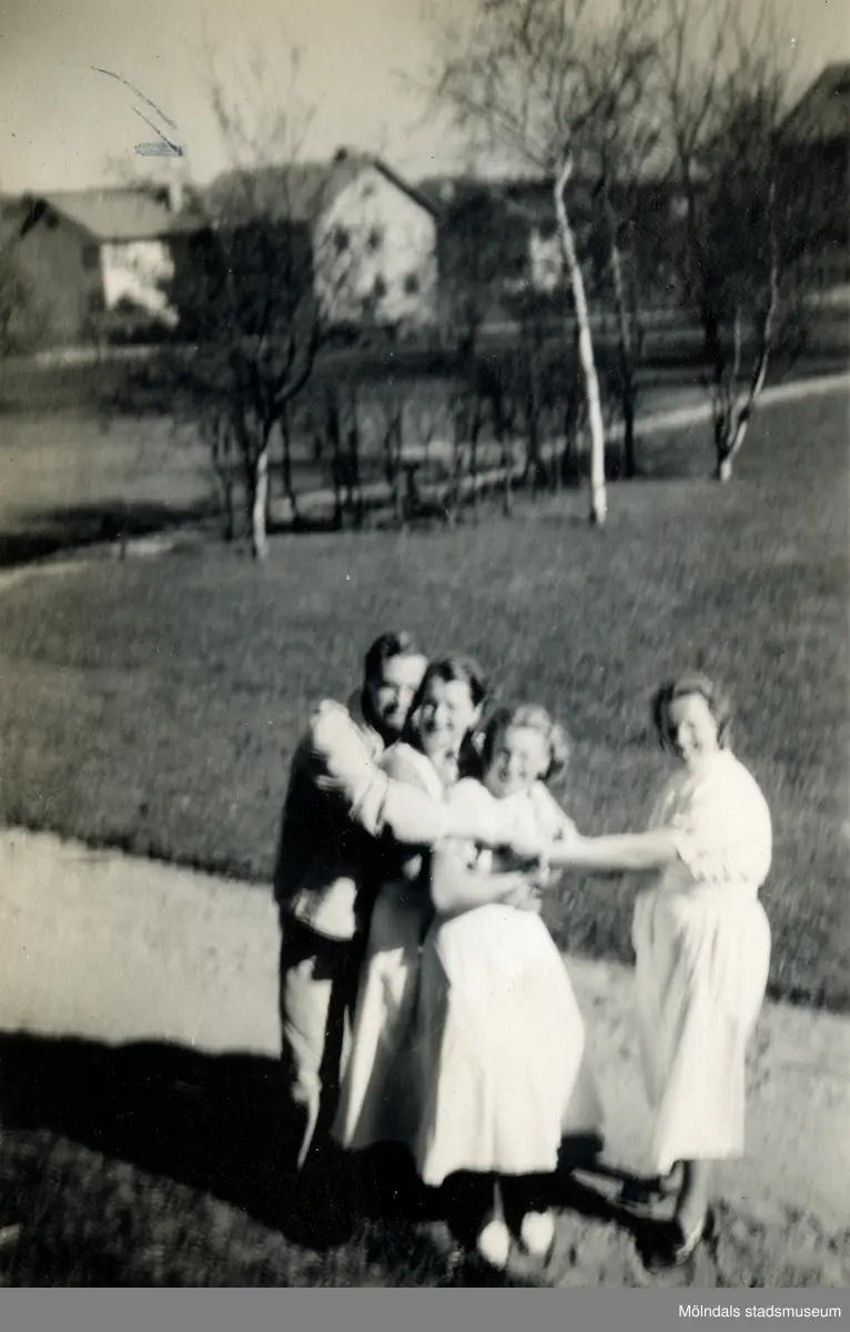 Tre sjukvårdsbiträden och en manlig patient står på en gräsmatta och håller i varandra, Mölndals sjukhus 1939 - 1941. Från vänster ses Ester Johansson (1914 - 2008, gift Faldahl) och Aina Englund (1914 - 2012). I bakgrunden ses några låga bostadshus. Bilder från fotoalbum vid Mölndals lasarett/sjukhus 1939 - 1941 på bland annat givarens mor Ester (född Johansson) tillsammans med kollegan/väninnan Aina Englund. De arbetade på den manliga kirurgavdelningen som vårdbiträden/undersköterskor.