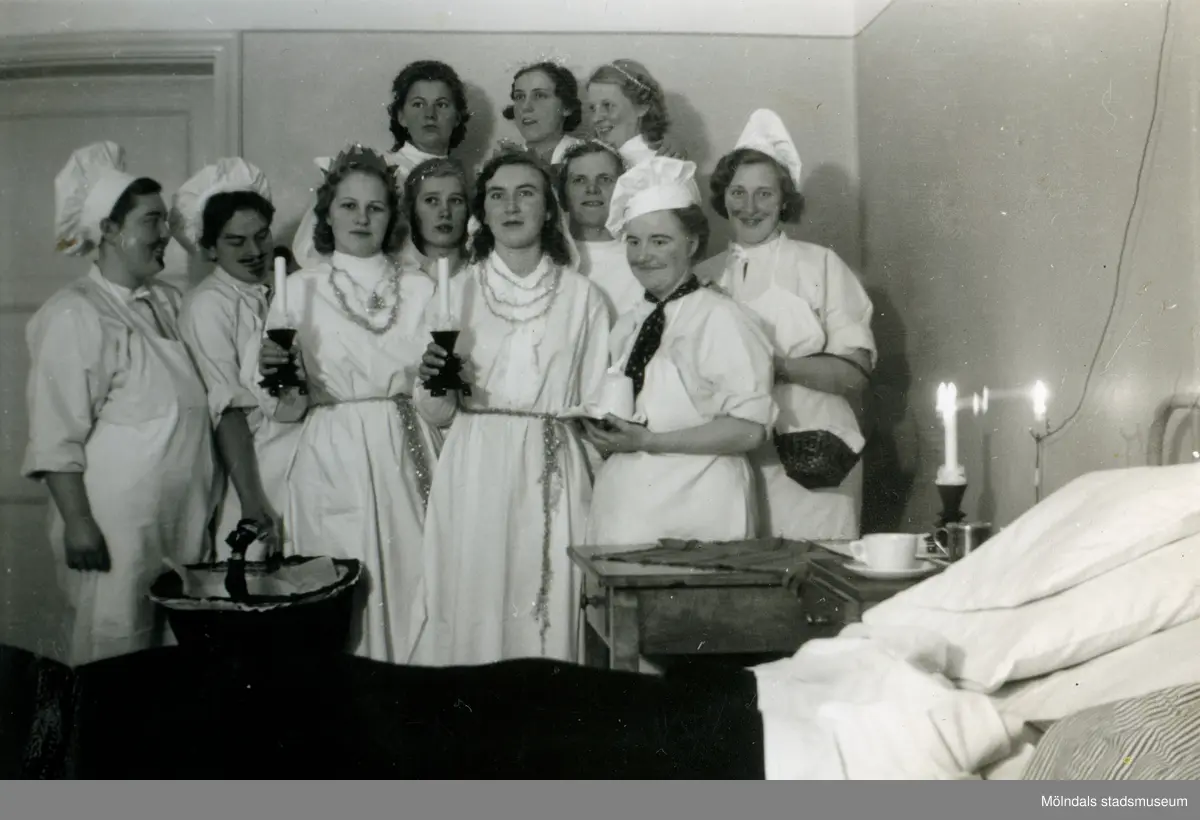 Elva lusseklädda kvinnor, sju sjukvårdsbiträden och fyra kökspersonal med vita kockmössor, står samlade bredvid en tom sjuksäng på den manliga kirurgavdelningen på Mölndals sjukhus 1939 - 1941. På sängbordet finns två tända ljus och ett par kaffekoppar. Baktill på sänggaveln sitter en temperaturkurva. Bilder från fotoalbum, tagna från södra sidan av Länsmansgatan vid Mölndals lasarett/sjukhus 1939 - 1941 på bland annat givarens mor Ester (född Johansson) tillsammans med kollegan/väninnan Aina Englund. De arbetade på den manliga kirurgavdelningen som vårdbiträden/undersköterskor.