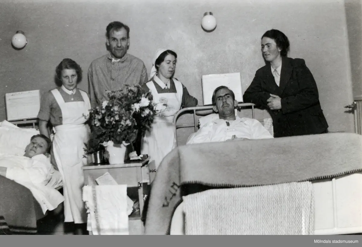 Tre kvinnliga sjukvårdsbiträden står bredvid tre manliga patienter, två som ligger i sina sjuksängar och en som står upp, på den manliga kirurgavdelningen, Mölndals sjukhus 1939 - 1941. Stående till vänster är Aina Englund (1914 - 2012), okänd i mitten och Ester Johansson (1914 - 2008, gift Faldahl) till höger. Baktill på männens sänggavlar sitter temperaturkurvor. Bilder från fotoalbum, tagna från södra sidan av Länsmansgatan vid Mölndals lasarett/sjukhus 1939 - 1941 på bland annat givarens mor Ester (född Johansson) tillsammans med kollegan/väninnan Aina Englund. De arbetade på den manliga kirurgavdelningen som vårdbiträden/undersköterskor.