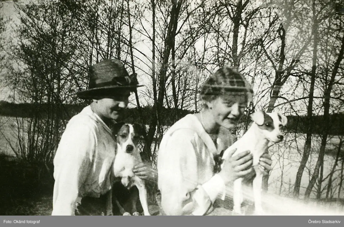 Damer med hundar vid sjö, ca 1920
