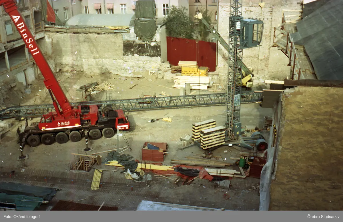 Kranbil mitt i ombyggnation av kvarteret Rådhuset, 1985-1986