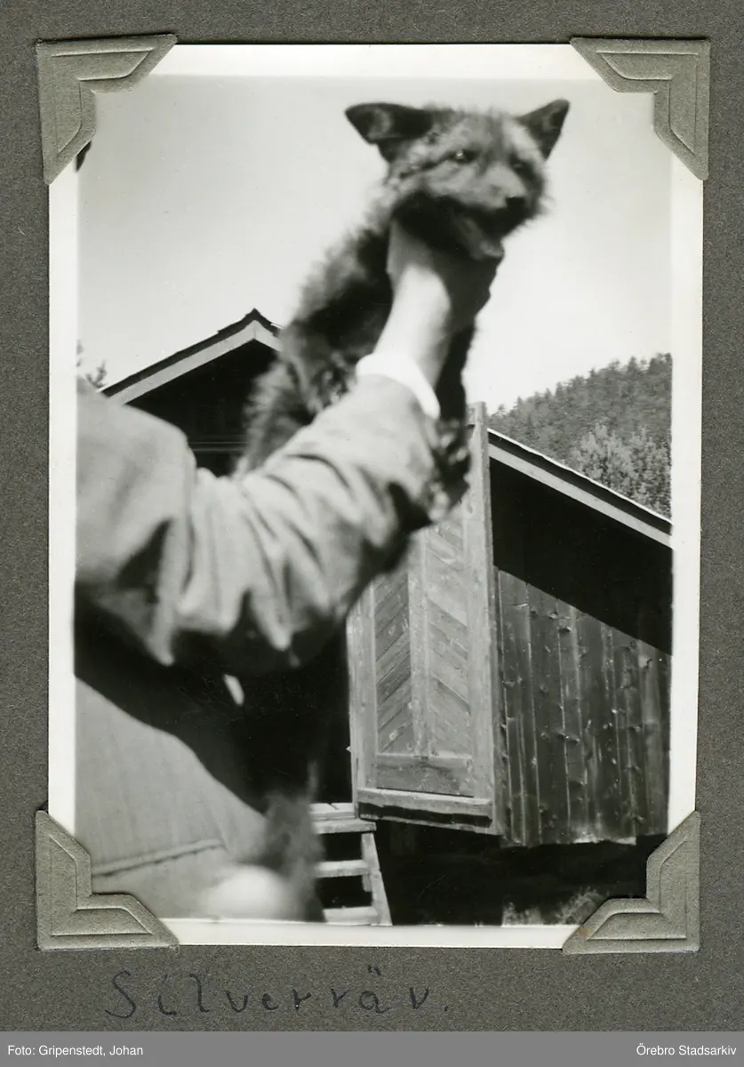 En hand håller en silverräv på slottet Fritzöehus i Norge, sommaren 1935