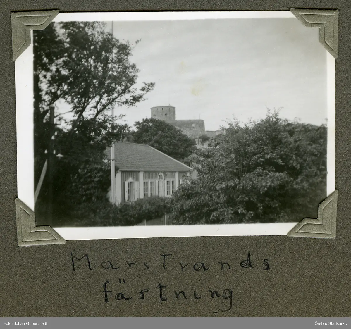Bakom hus och träd syns Marstrands fästning, 1935
