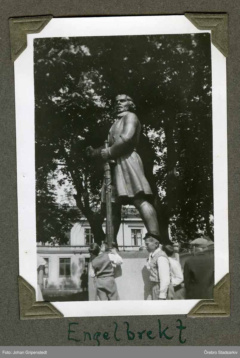 Besök vid Engelbrektsstatyn i Arboga på bussutflykt, 1936