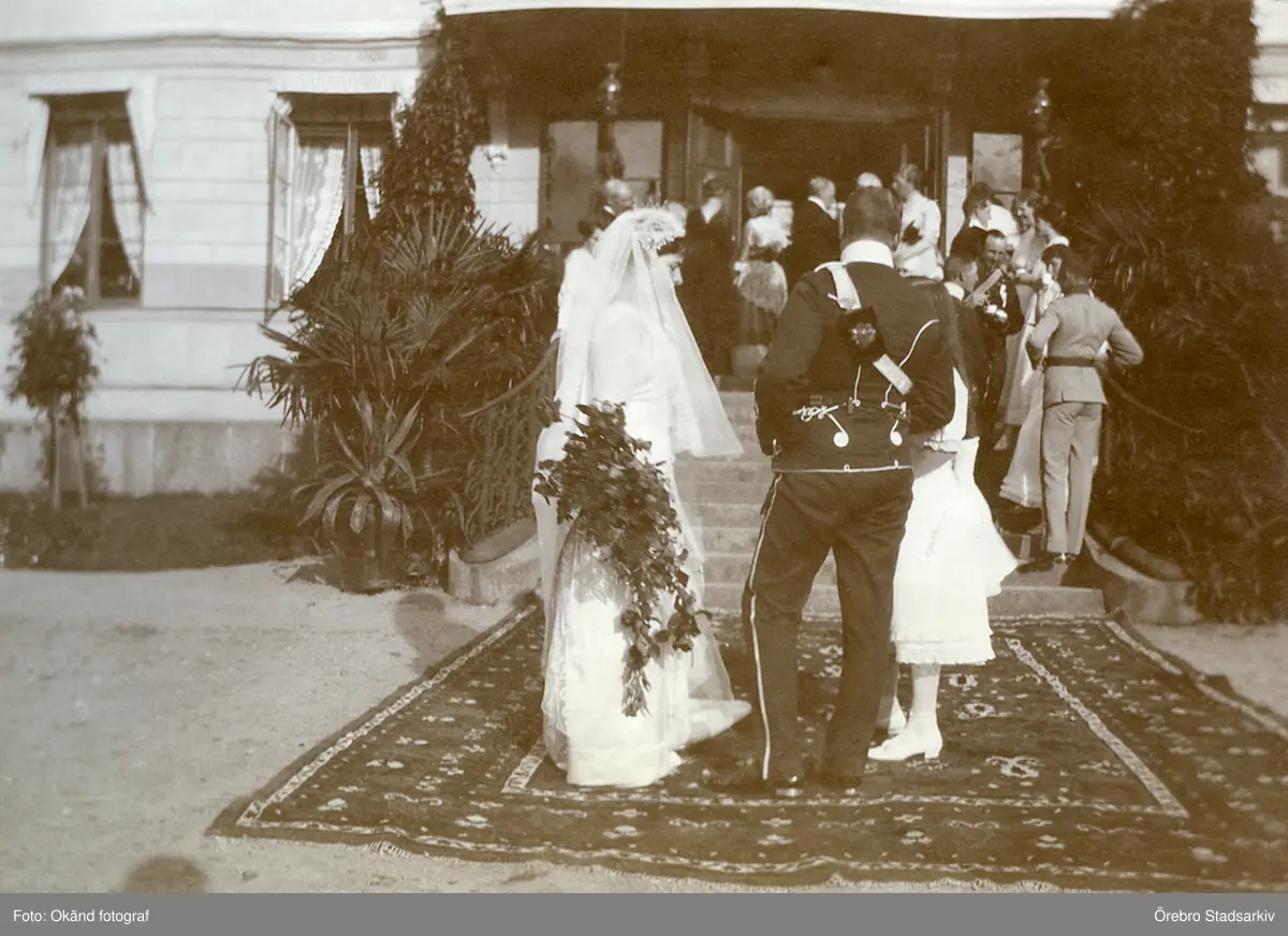 Brudparet vid herrgårdstrappan på Färna herrgård, 1915-08-14
