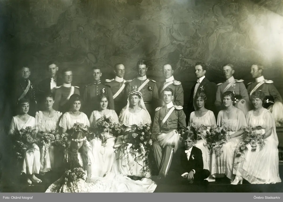 Brudpar med tärnor och marskalker i fotoateljé, ca 1920