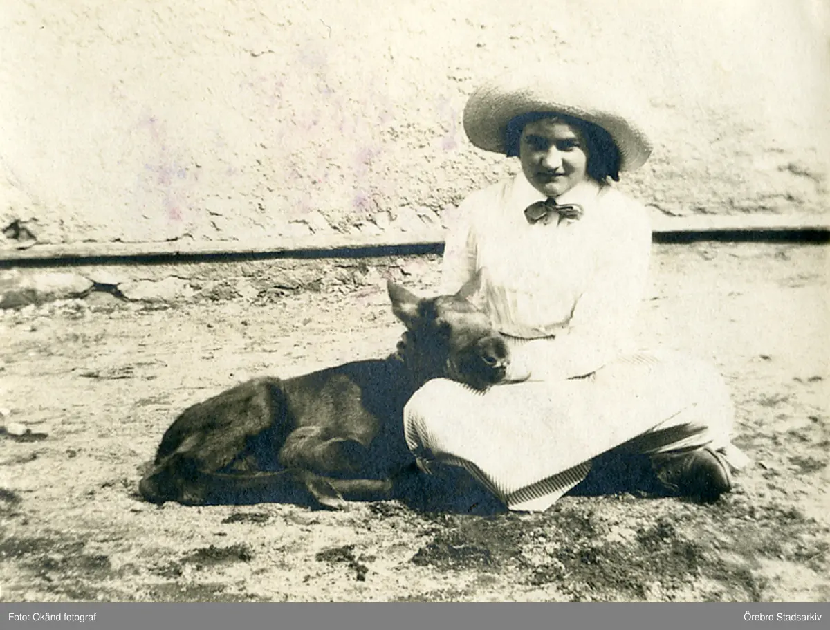 Anna Nordenfalk med en älgkalv på Färna herrgård, 1912