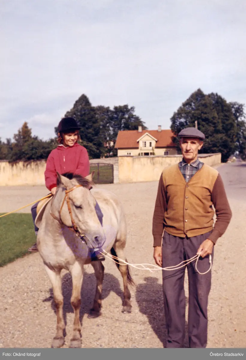 Eva Gripenstedt till häst ledd av okänd man, 1964