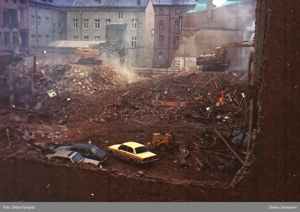 Två grävskopor river väggar inför ombyggnation av kvarteret Rådhuset, 1985-1986