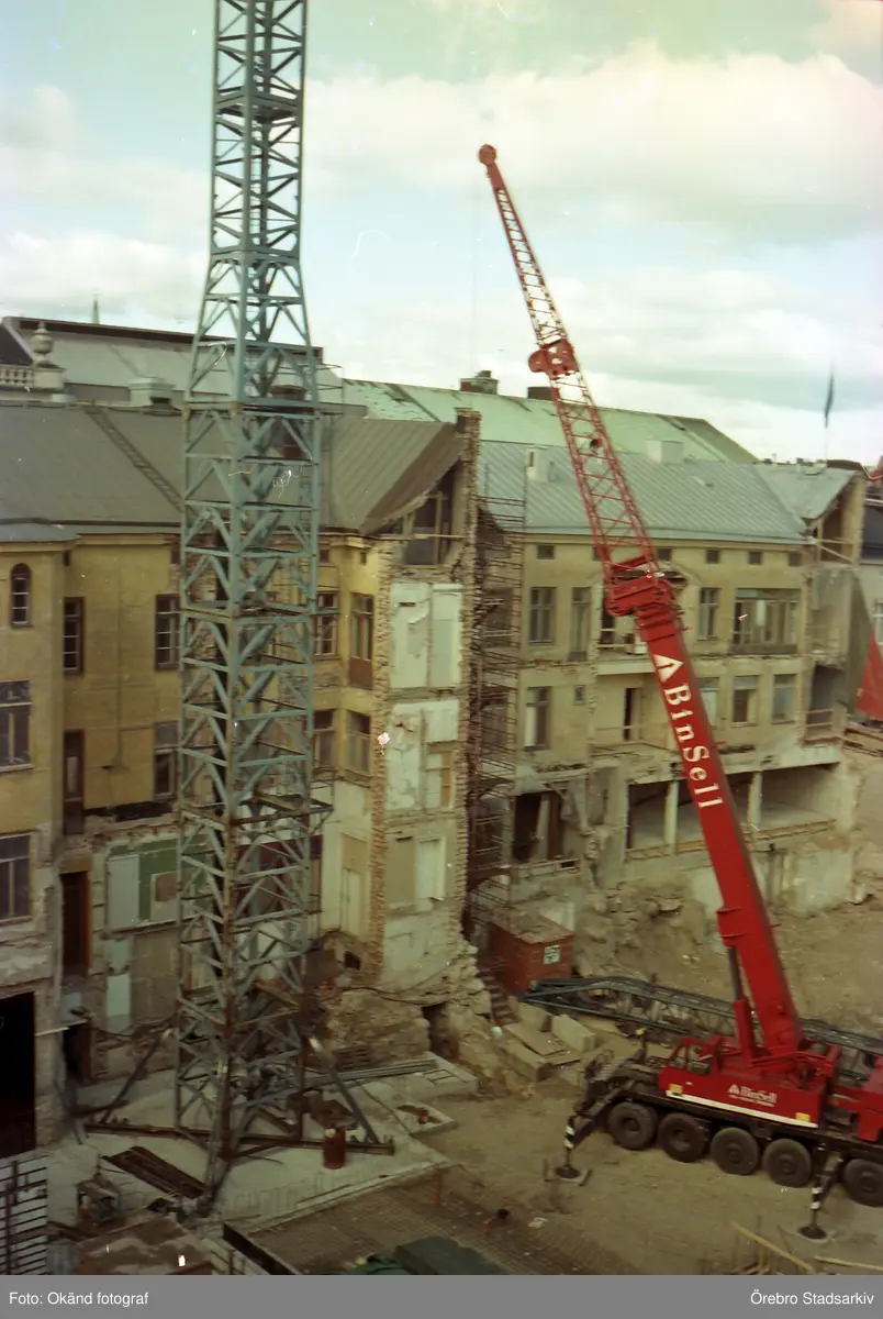 Kranbil vid husvägg vid ombyggnation av kvarteret Rådhuset, 1985-1986