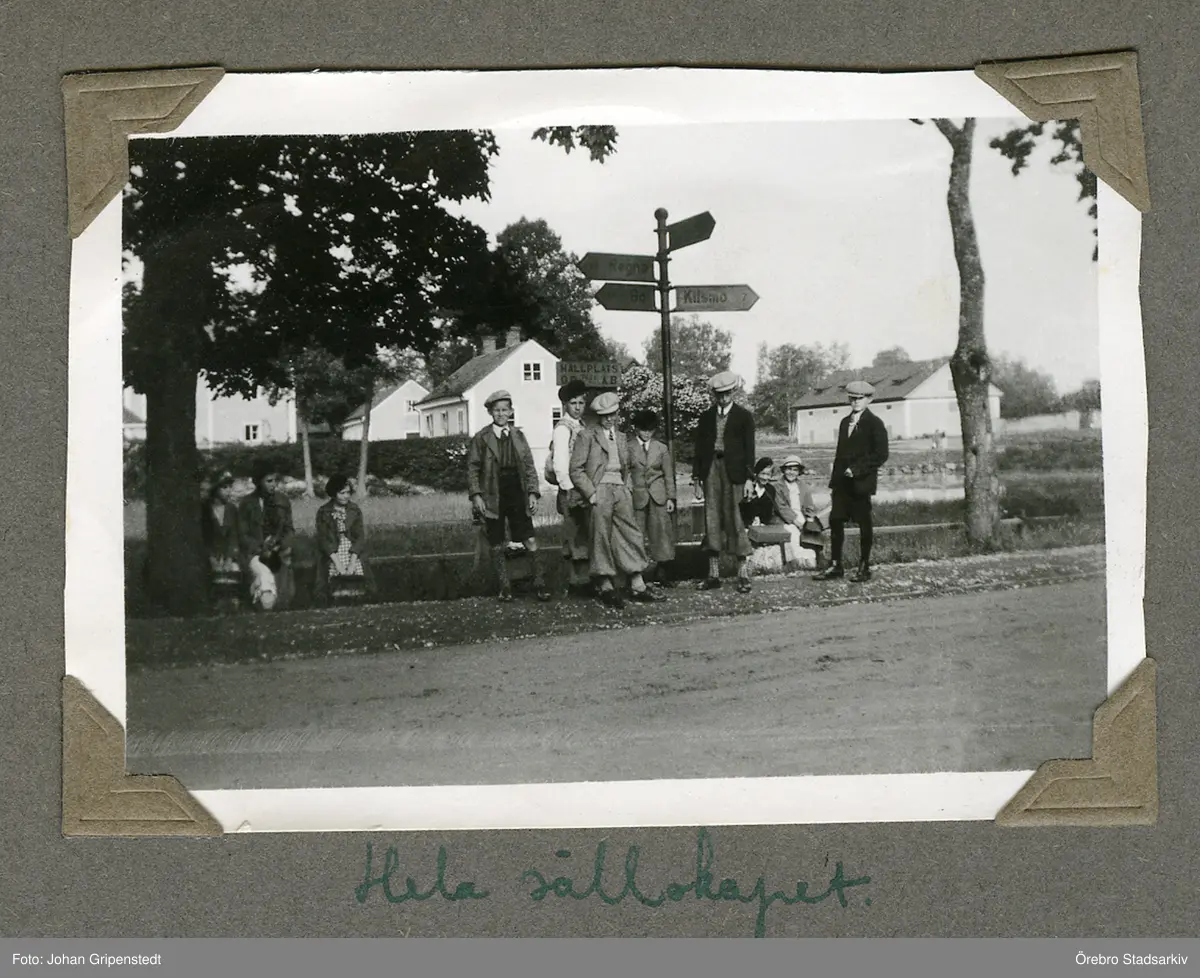 Ungdomar vid busshållplats inför bussutflykt, 1936