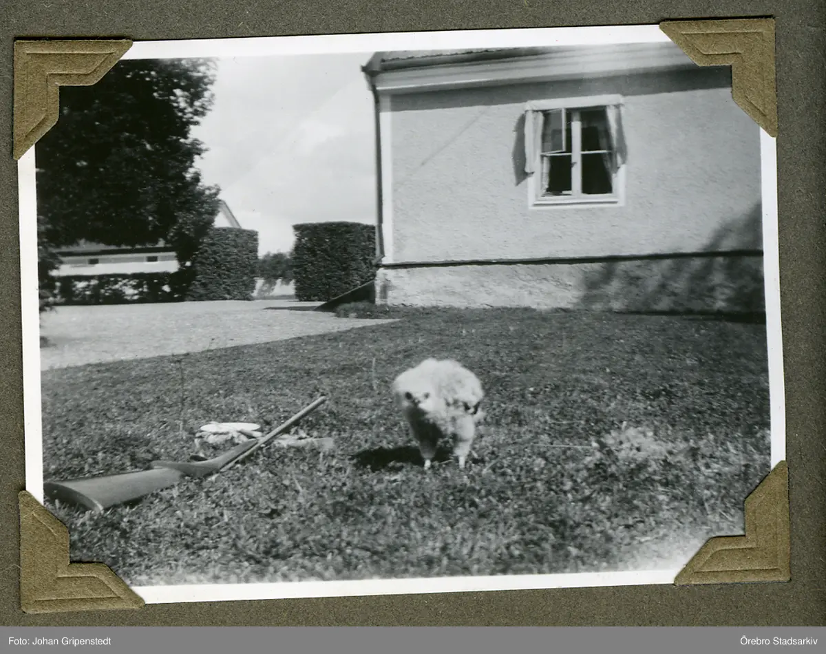 Ung rovfågel på gräsmattan på Brevens bruk, sommaren 1938