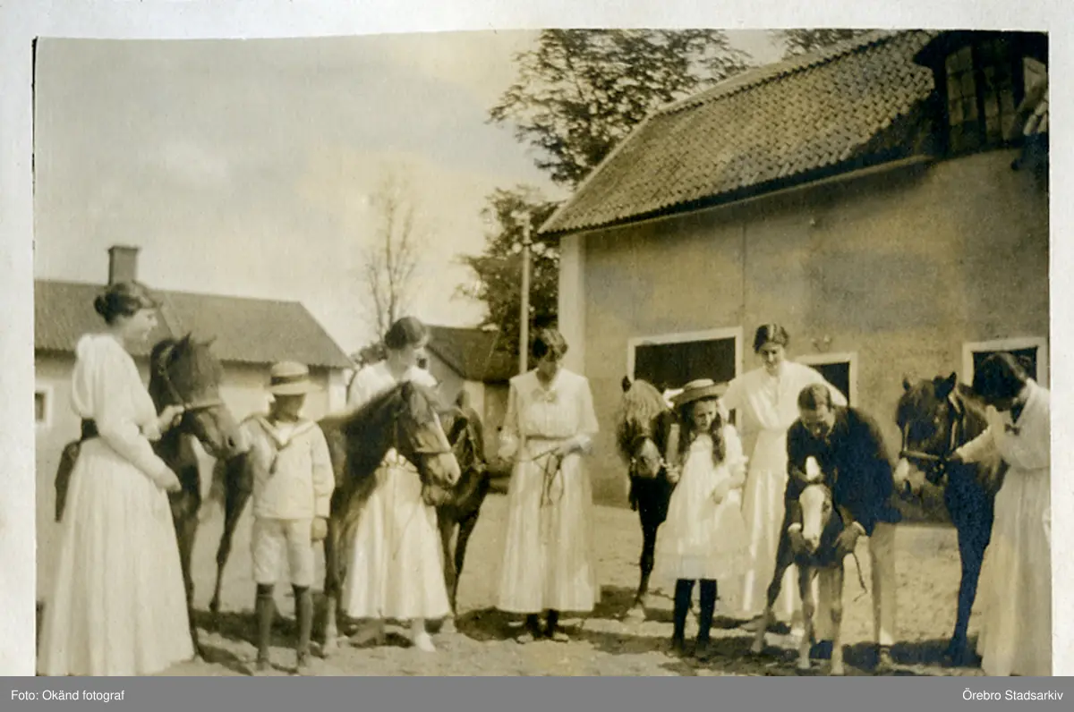 Sällskap med hästar på stallbacken vid Färna herrgård, ca 1920