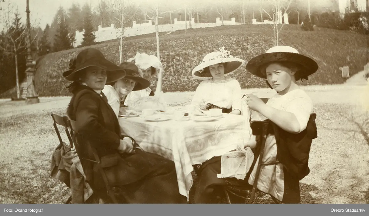 Fem unga damer med stora hattar vid fikabordet, 1918