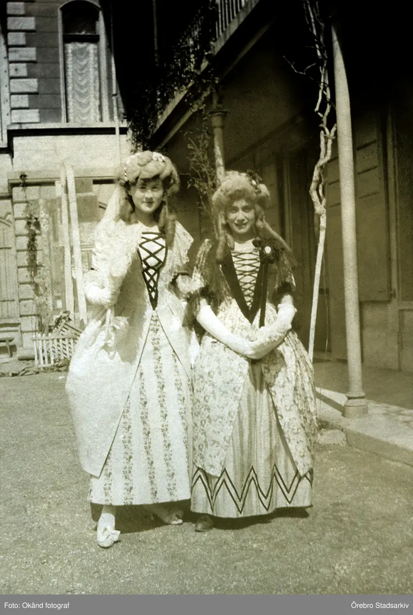 Två unga kvinnor i 1700-talsklänningar, 1918