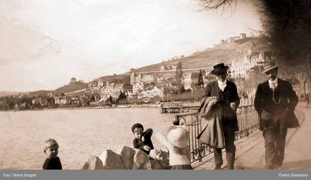Lekande barn pch två män på promenad vid sjön, 1918