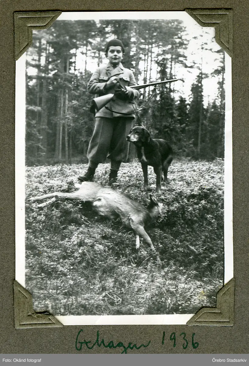 Ung jägare med hund och fällt rådjur i Oxhagen på Brevens bruk, 1936