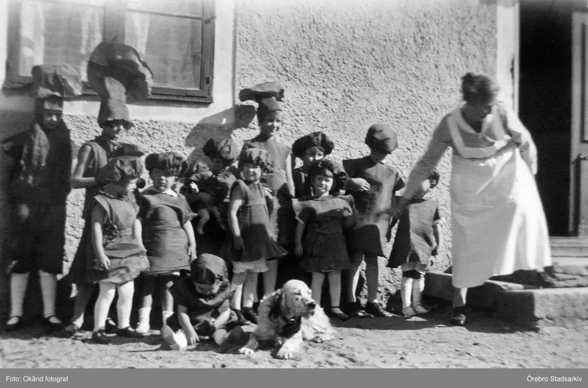Utklädda barn med hund och vaktande kvinna på Färna herrgård, 1926