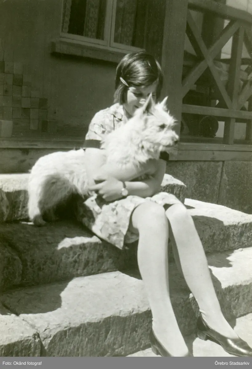 Flicka med vit hund på trappan till Färna herrgård, 1920-tal