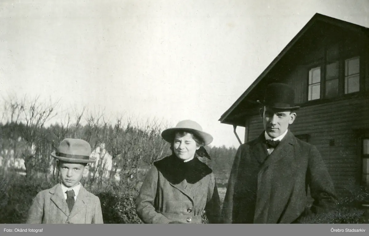 Tre personer i hatt vid Färna herrgård, ca 1920