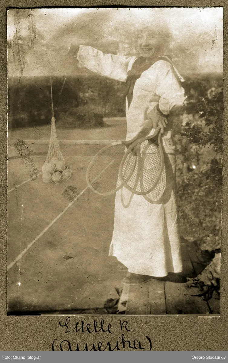 Estelle med tennisracket och bollar i nät på tennisbanan, 1918