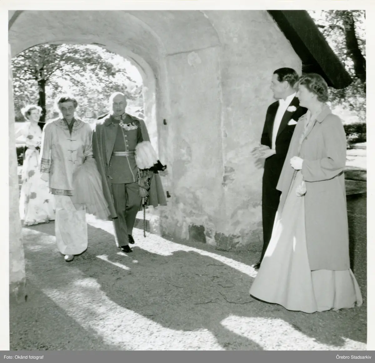 Bröllopsgäster tas emot vid kyrkporten vid Danderyds kyrka, 1952-06-17