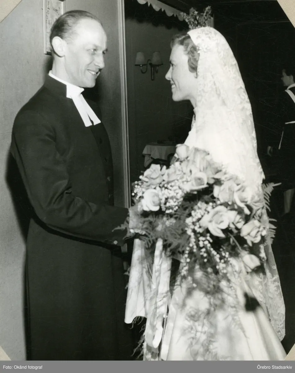 Vigselförrättare och brud på bröllopsfesten vid Stockholms golfklubb, 1952-06-17