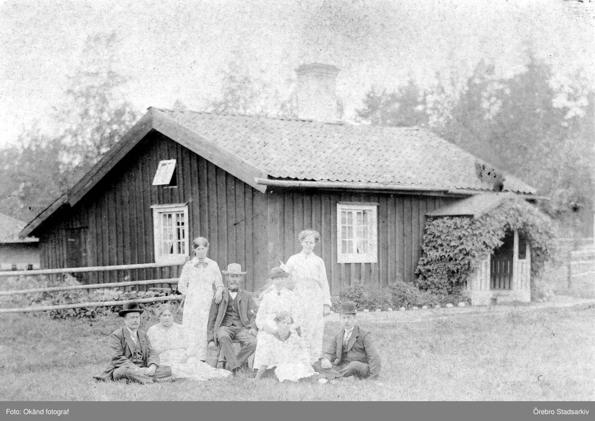 Familj framför hus i Kärrgruvan i Svartå, 1900-tal