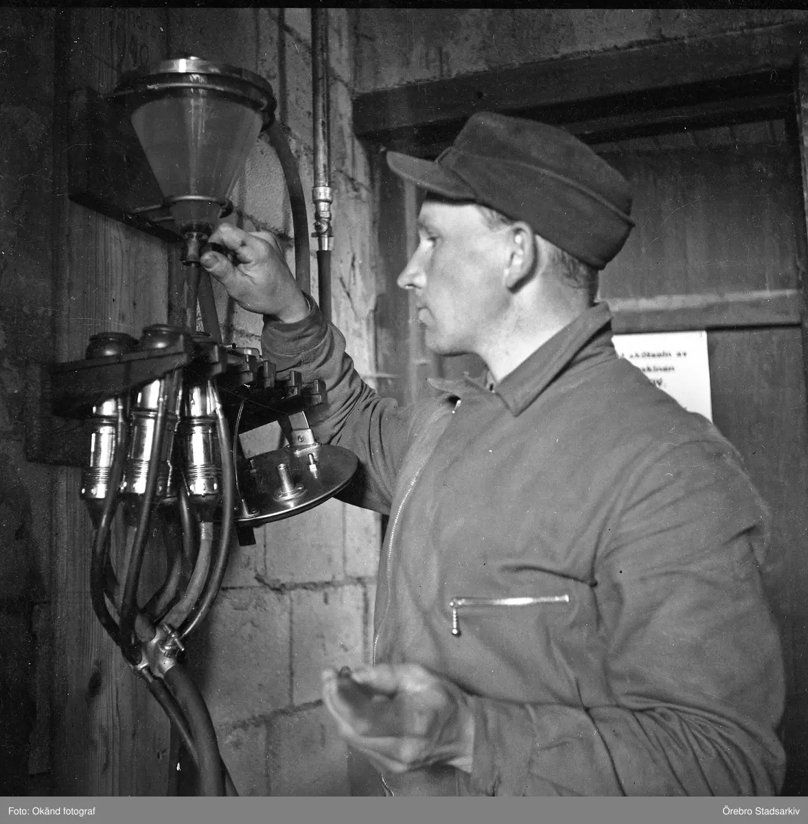 David Karlsson utövar tillsyn av mjölkningsmaskin hemma på Karlstorp, 1950-tal