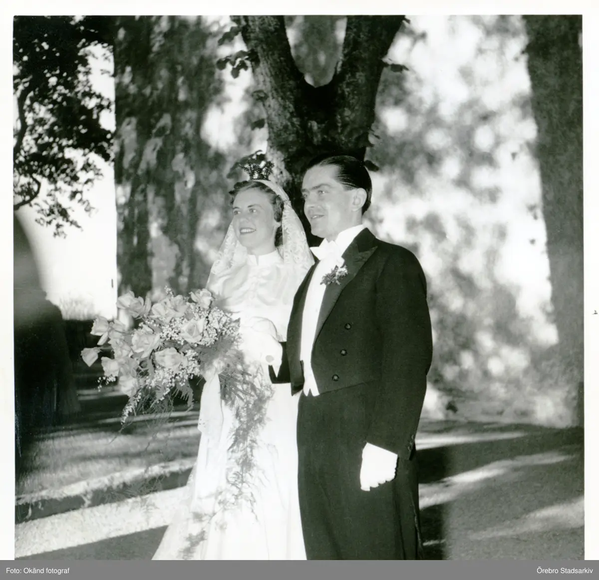 Brudpar nära kyrkporten vid Danderyds kyrka, 1952-06-17