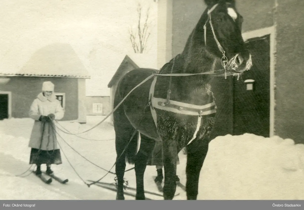 Anna Nordenfalk tolkar efter häst vid Färna herrgård, ca 1920