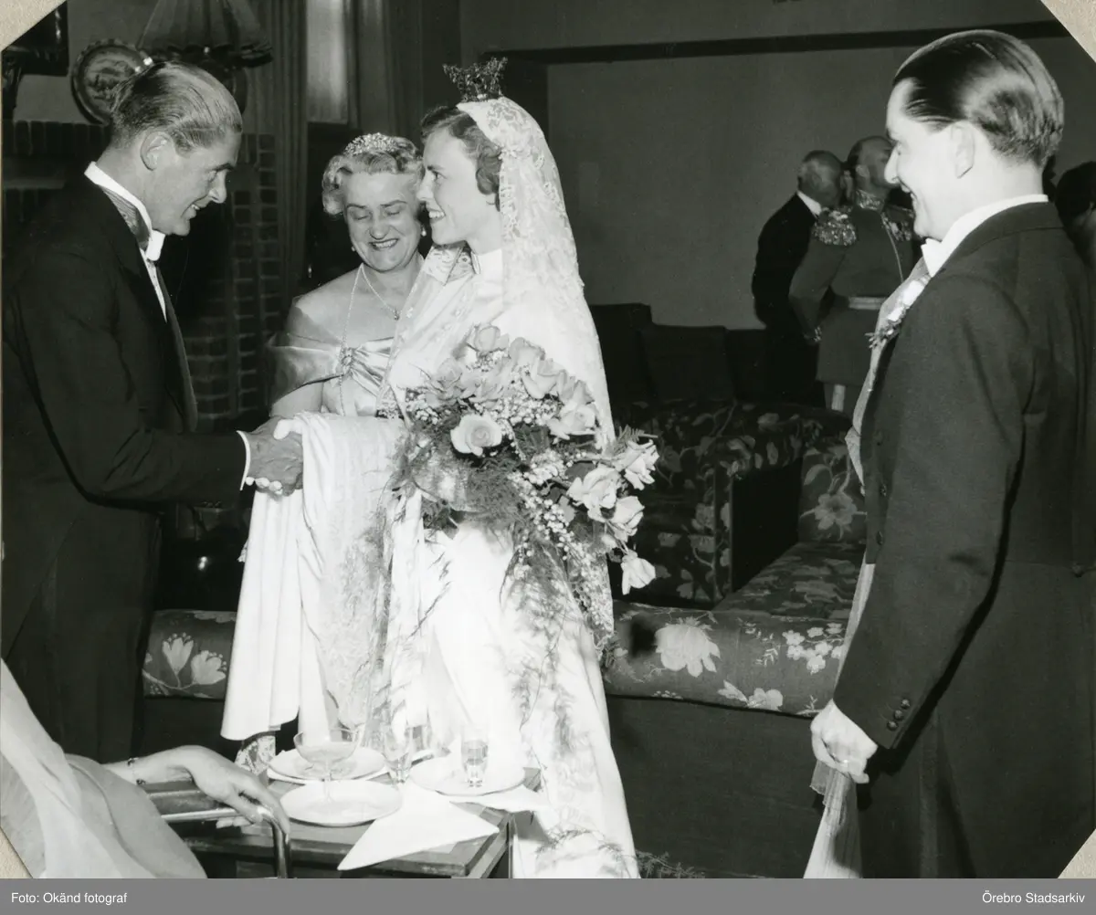 Brudpar med föräldrar och gäster på Stockholms golfklubb, 1952-06-17