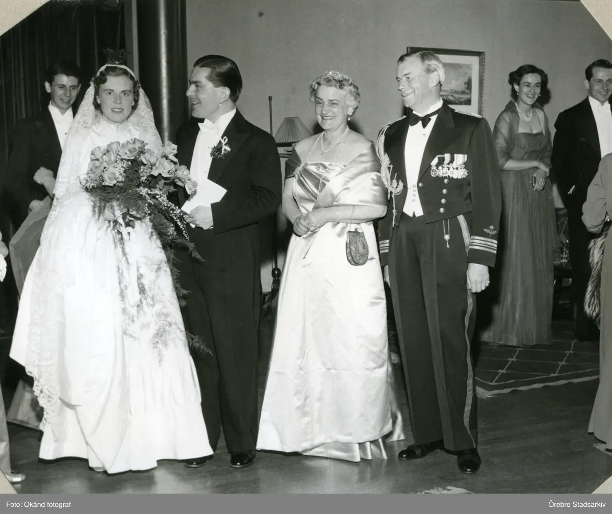 Brudpar, föräldrar och bröllopsgäster på Stockholms golfklubb, 1952-06-17