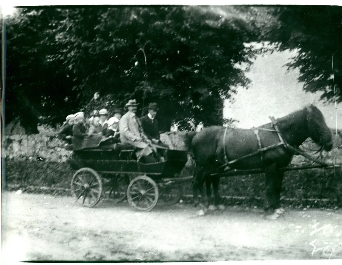 Hästskjuts med konfirmander utanför Täby Kyrka