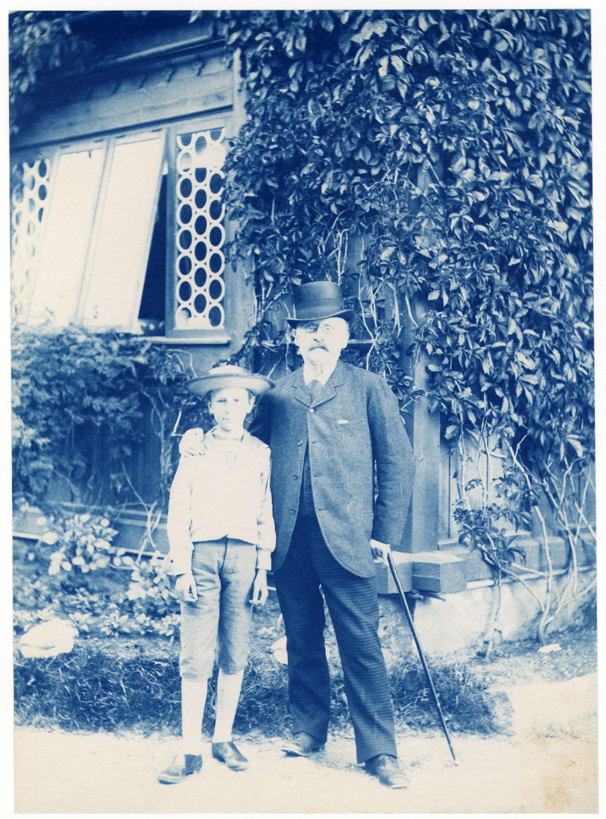 Carl och Calla Curmans son Sigurd och en äldre man framför en av Curmans villor, "Storstugan". Bilden tagen omkring 1890.
