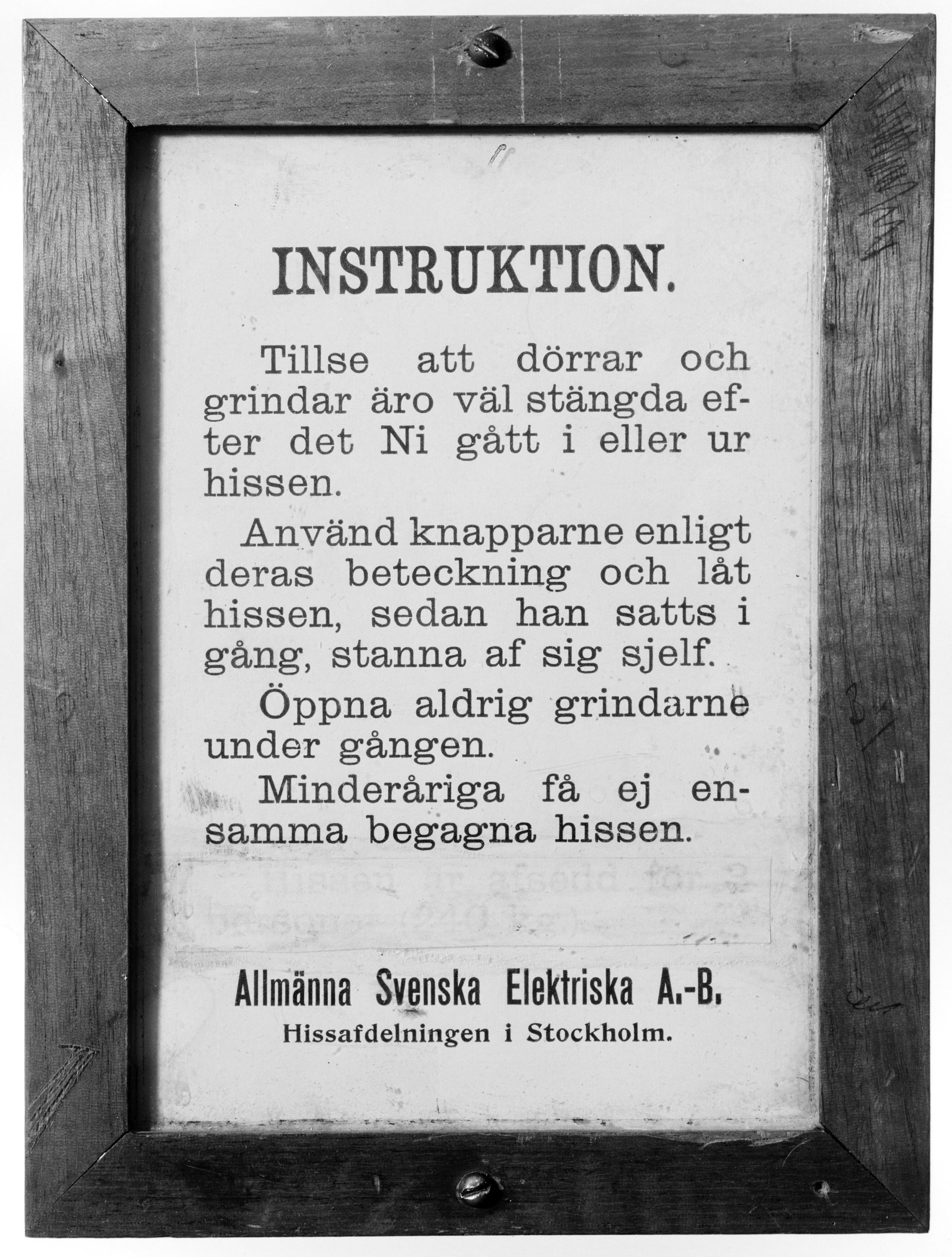 Instruktion för användning av en av Stockholms äldsta hissar på Arkivgatan 3.