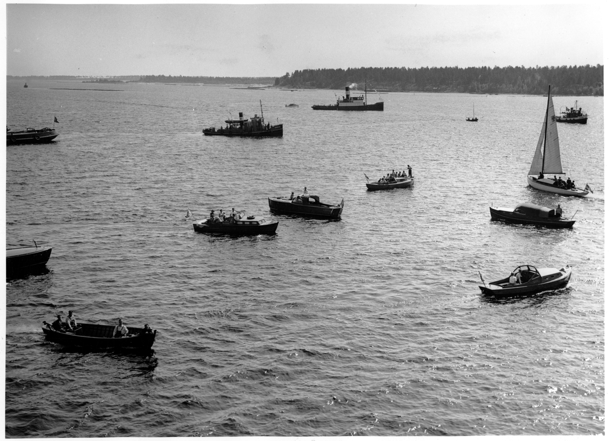 Invigning av vägbro mellan Bergnäset och Luleå. Båtar på vattnet vid den nyöppnade bron.