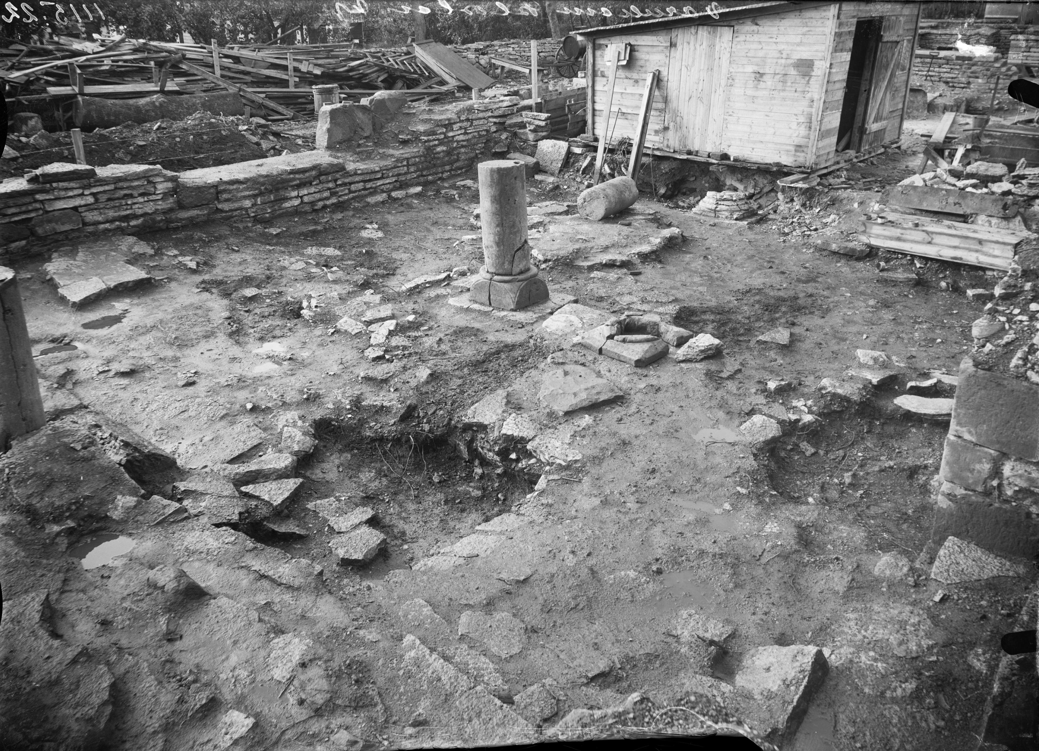Kolonnrummets västra mur, mittpartiet. Längst till vänster en dörrsmyg. Från sydöst.