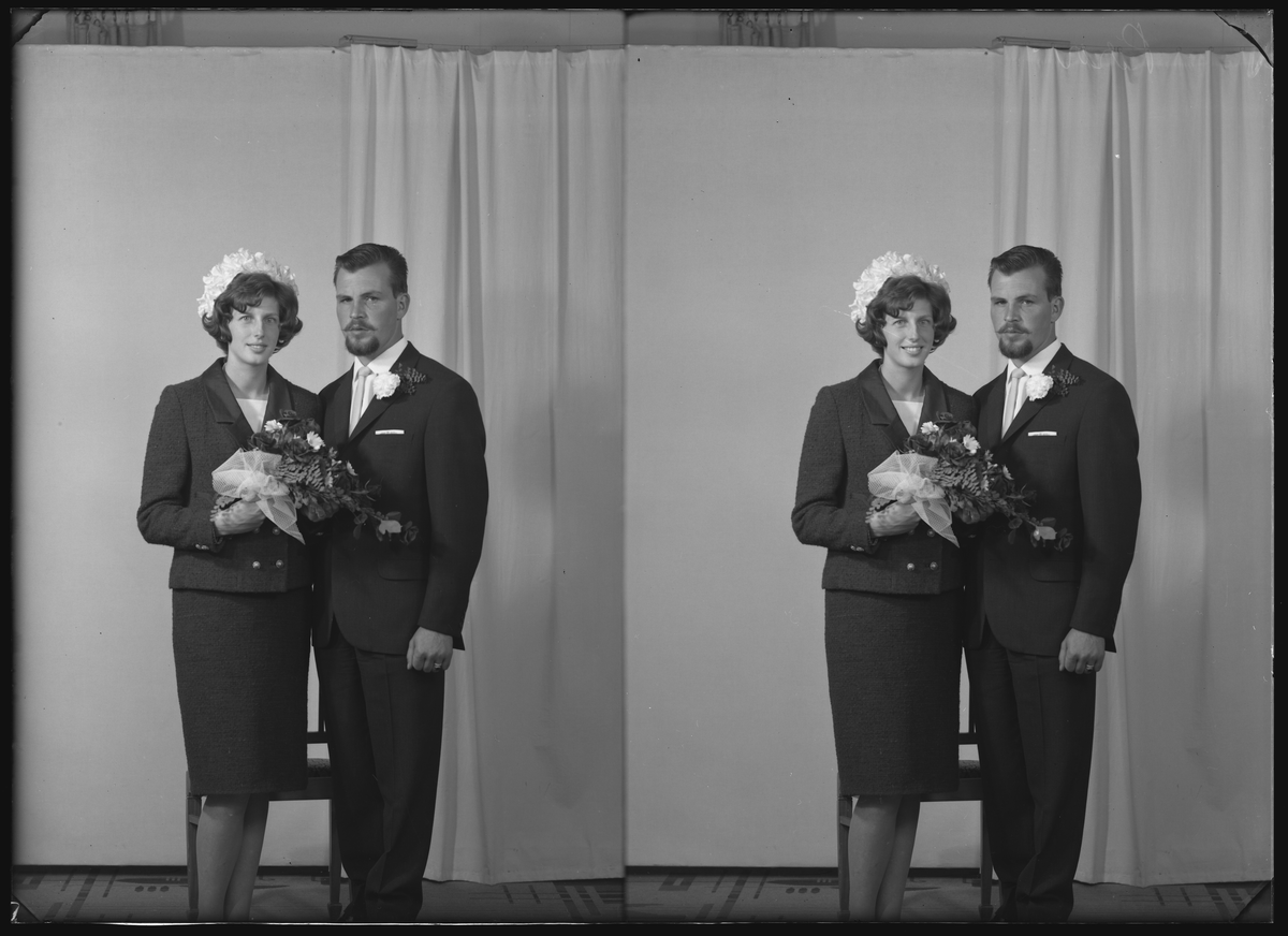 Porträtt, brudpar. Göran Norstedt, Narvavägen 73, Västerås. (Herrskogen, Strömsholm). Ur Gustaf Åhmans samling.