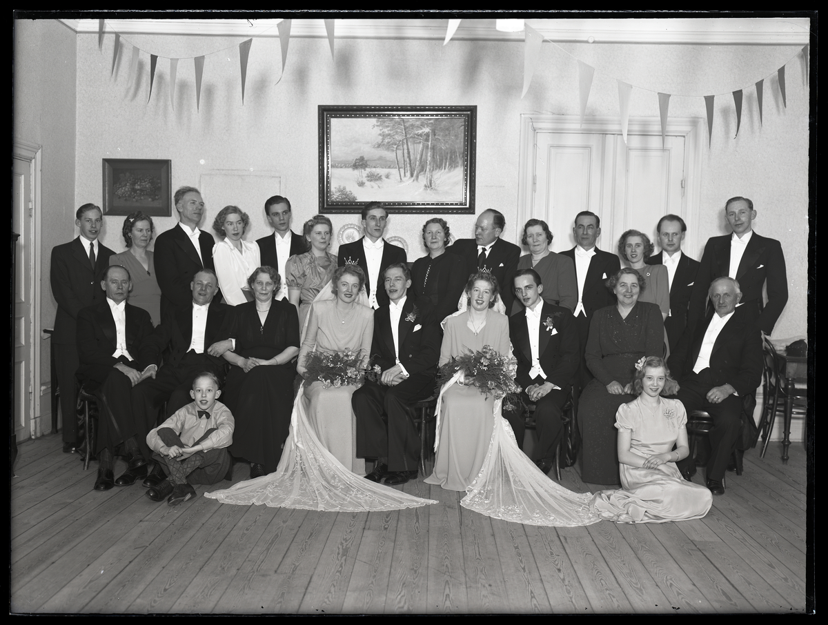 Grupporträtt, bröllop (2 st brudpar). Olle Johanson, Sten Svensson, Vävaren, Hallstahammar.