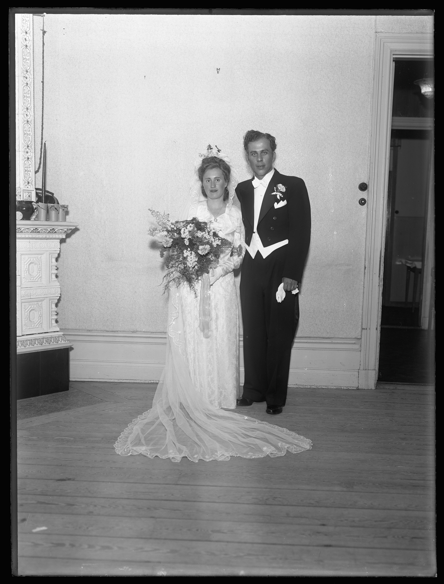 Grupporträtt, brudpar. Bertil Norén, Näsborg, Näs, Hallstahammar.