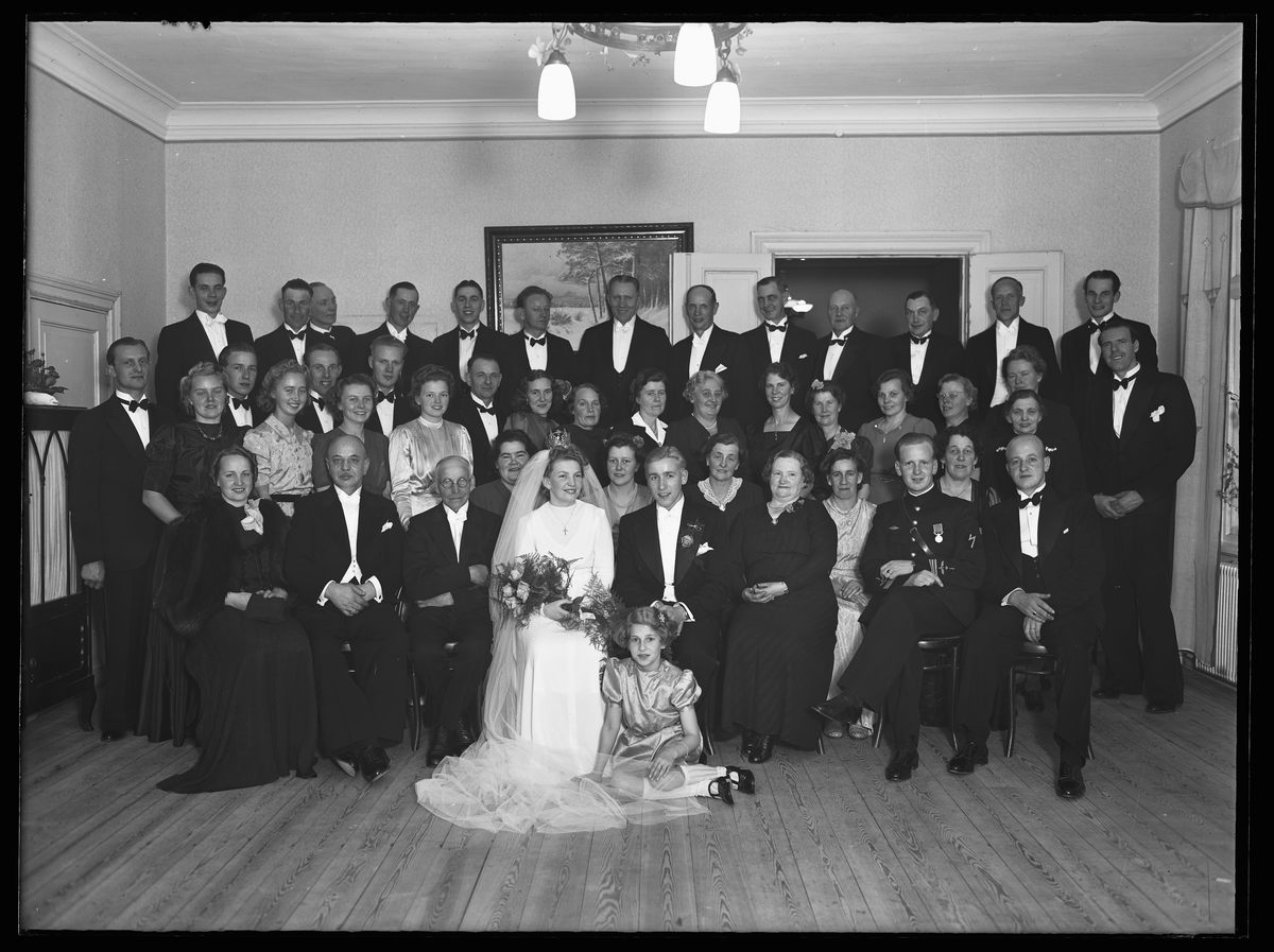 Grupporträtt, brudpar med större grupp. Gustafsson.