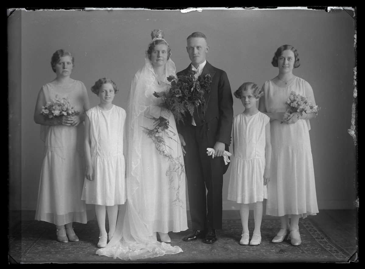 Grupporträtt, brudpar och tärnor. Pettersson, Bolunda.