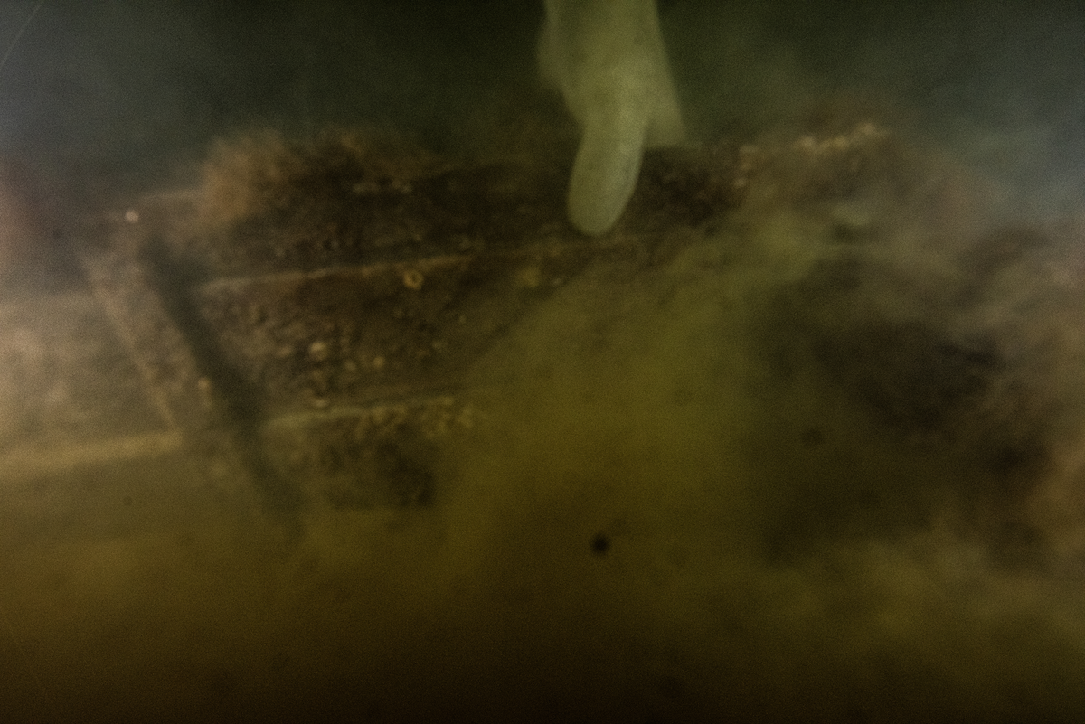 Den förliga delen av fartygslämningen där man kan se de tunna borden samt de klena