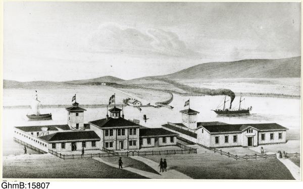 Badinrättningen vid "S:t Eriks hörn", byggd 1835, den vänstra, större för herrar, den högra, mindre för damer. Nedrevs då Hisingsbron byggdes 1874.