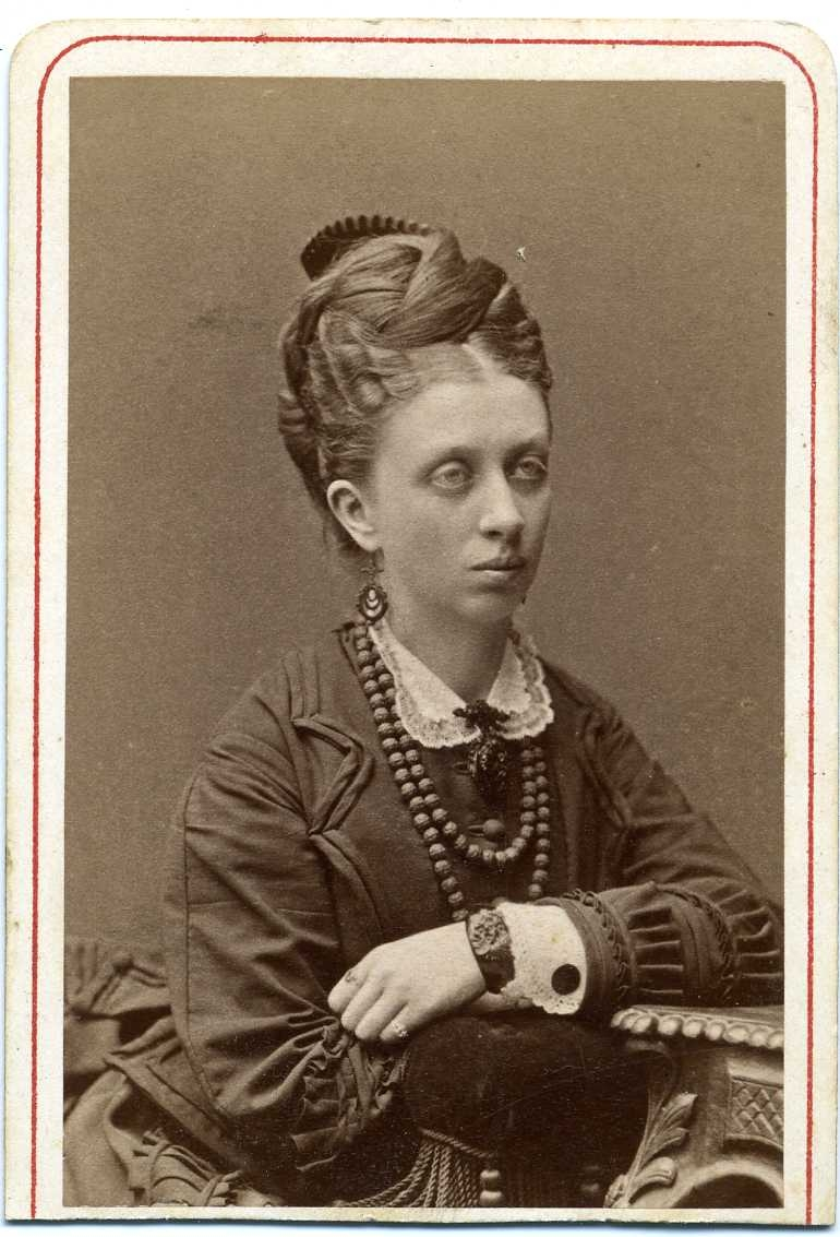 Porträtt av en kvinna med uppsatt hår och örhängen, vilar mot en stolsrygg/bord.