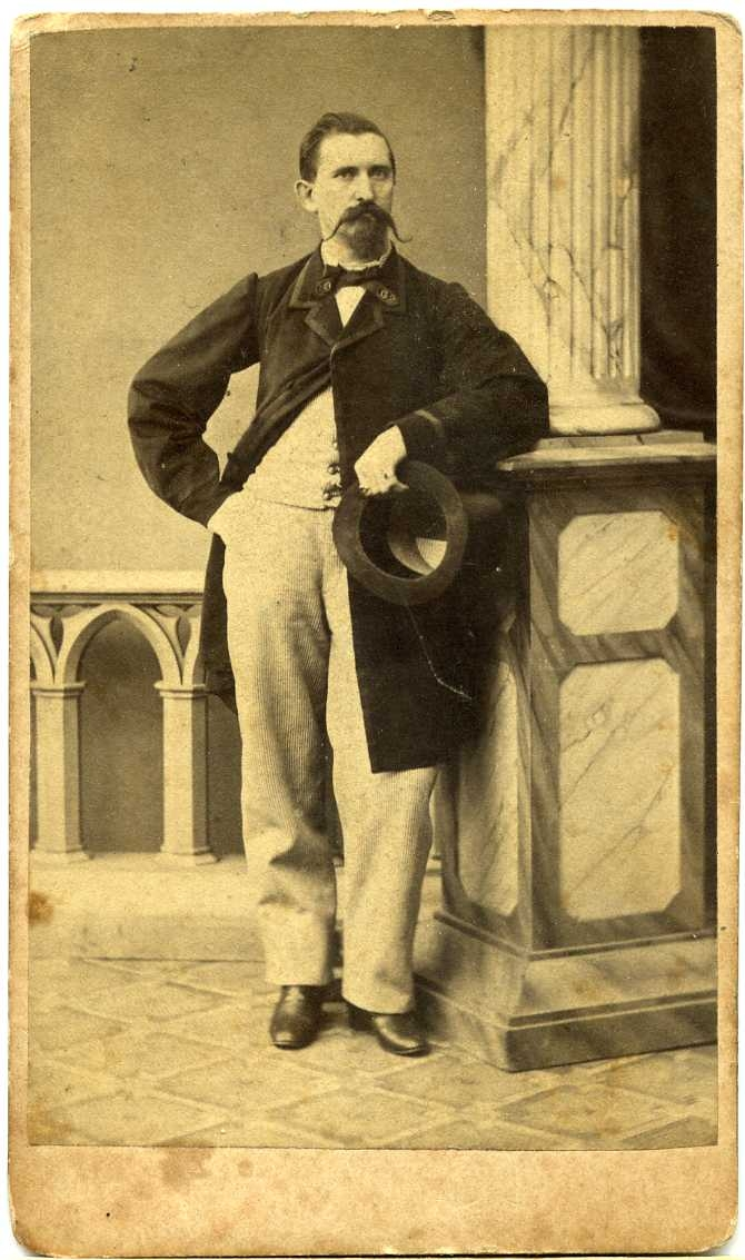 Porträtt av en man i rock, med hög hatt i vänster hand. Han står lutad mot en kolonnbas.