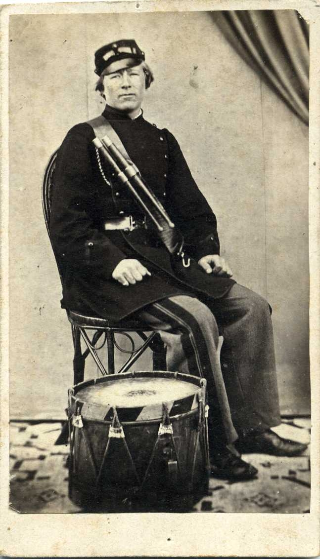 Porträtt av en i skarpskyttekårs uniform med två trumpinnar i ett band över bröstet. En bastrumma ligger på golvet intill honom.