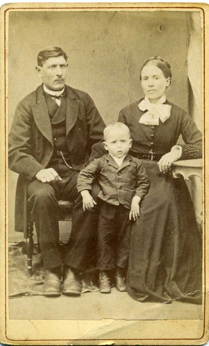 Familjegrupp: man, kvinna och ett barn som står framför de sittande föräldrarna.
