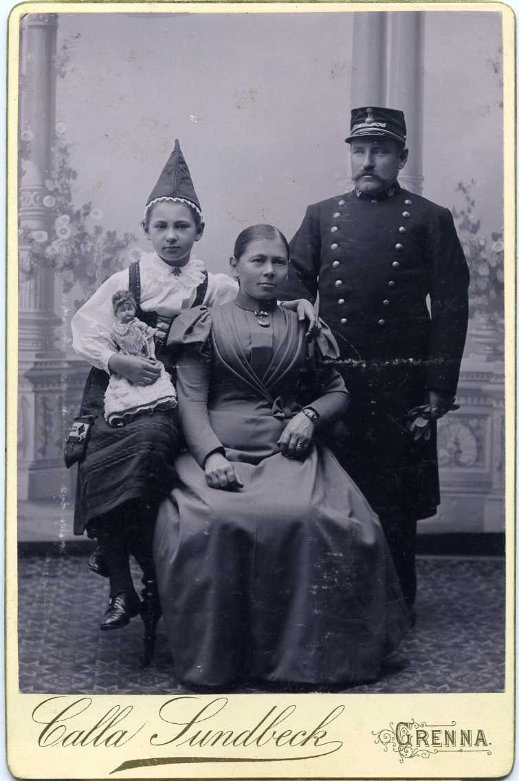En familjegrupp: mamma, pappa och dotter Brockman. Mannen bär poliskonstapels uniform. Flickan har en strutmössa och bär en klänning av folkdräktskaraktär. Hon håller en docka i famnen.